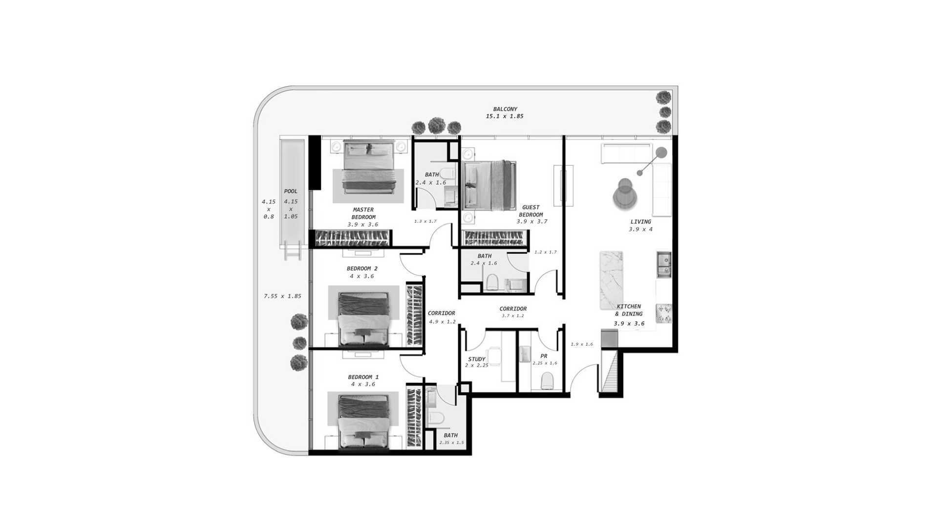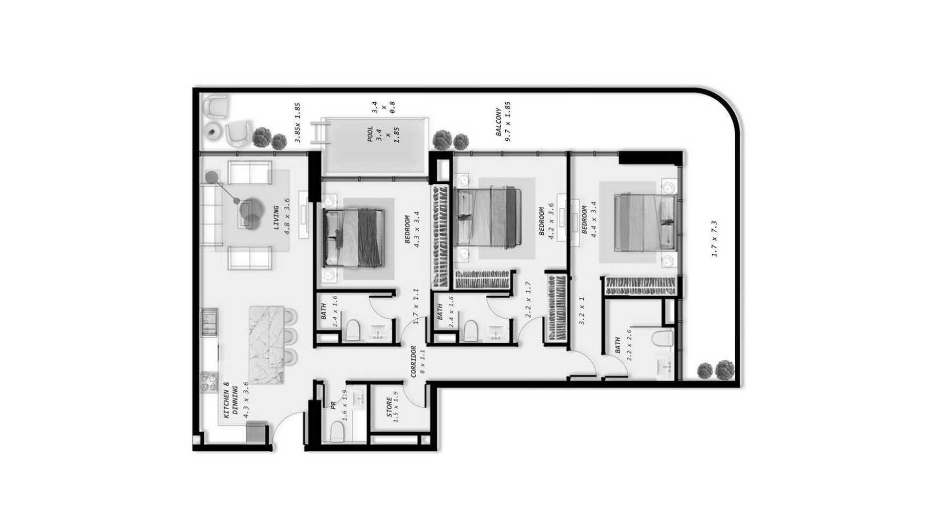 Byt půdorys, 2 ložnice v Ocean Pearl Č.: 646604