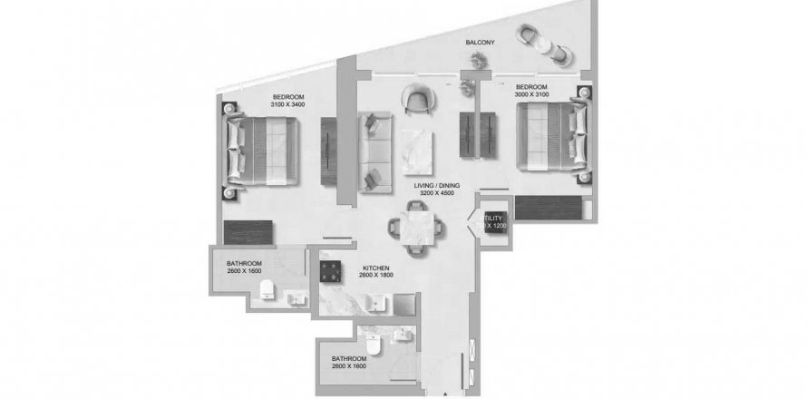Byt půdorys «2BR», 2 ložnice v The Tranquil at Sobha Central
