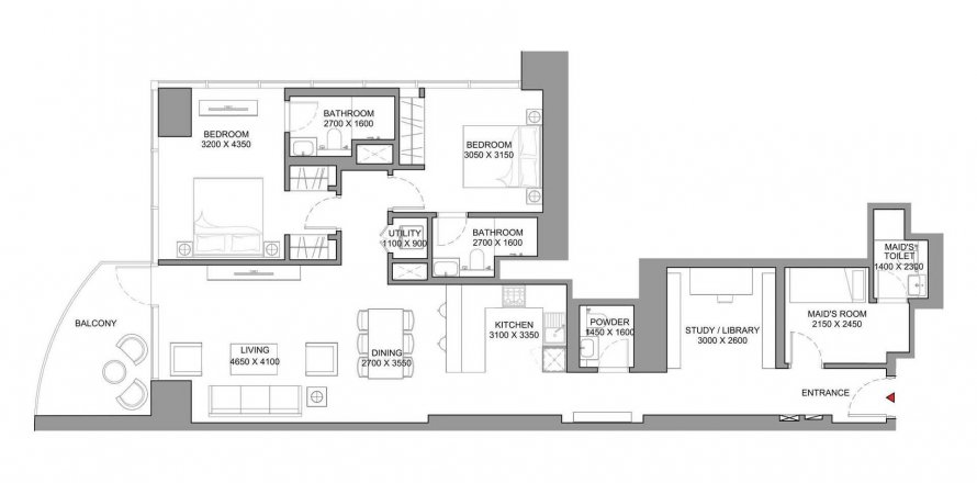 Denah «TYPE C-V1», 2 kamar tidur di SKYSCAPE AURA
