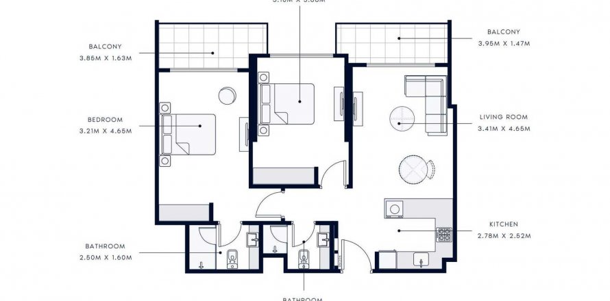 Планировка «TYPE 01» 3 комнаты в ЖК AZIZI AMBER